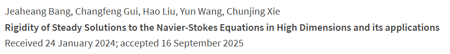 论文“Rigidity of Steady Solutions to the Navier-Stokes Equations in High Dimensions and its applications”在稳态Navier-Stokes方程的研究取得了重要进展。