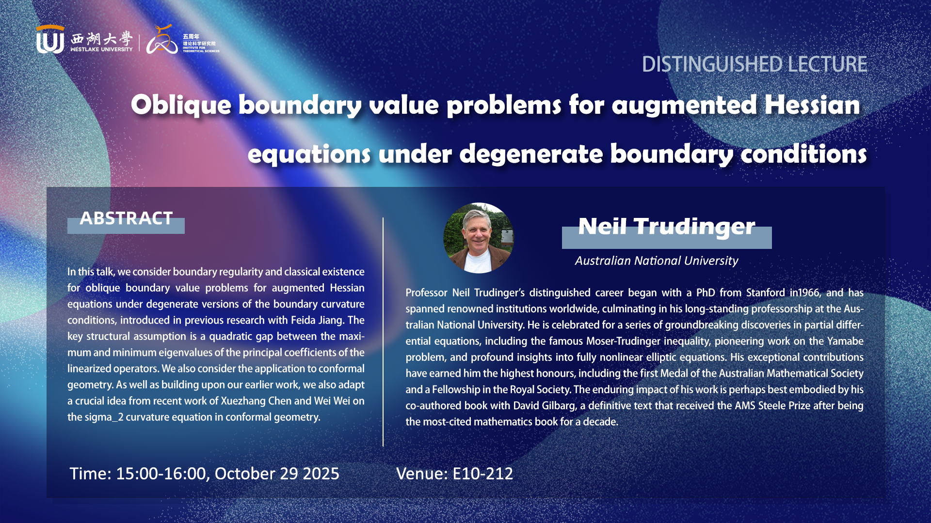 主讲人简介:Professor Neil Trudinger's distinguished career began with a PhD from Stanford in 1966, and has spanned renowned institutions worldwide, culminating in his long-standing professorship at the Australian National University. He is celebrated for a series of groundbreaking discoveries in partial differential equations, including the famous Moser-Trudinger inequality, pioneering work on the Yamabe problem, and profound insights into fully nonlinear elliptic equations. His exceptional contributions have earned him the highest honours, including the first Medal of the Australian Mathematical Society and a Fellowship in the Royal Society. The enduring impact of his work is perhaps best embodied by his co-authored book with David Gilbarg, a definitive text that received the AMS Steele Prize after being the most-cited mathematics book for a decade.