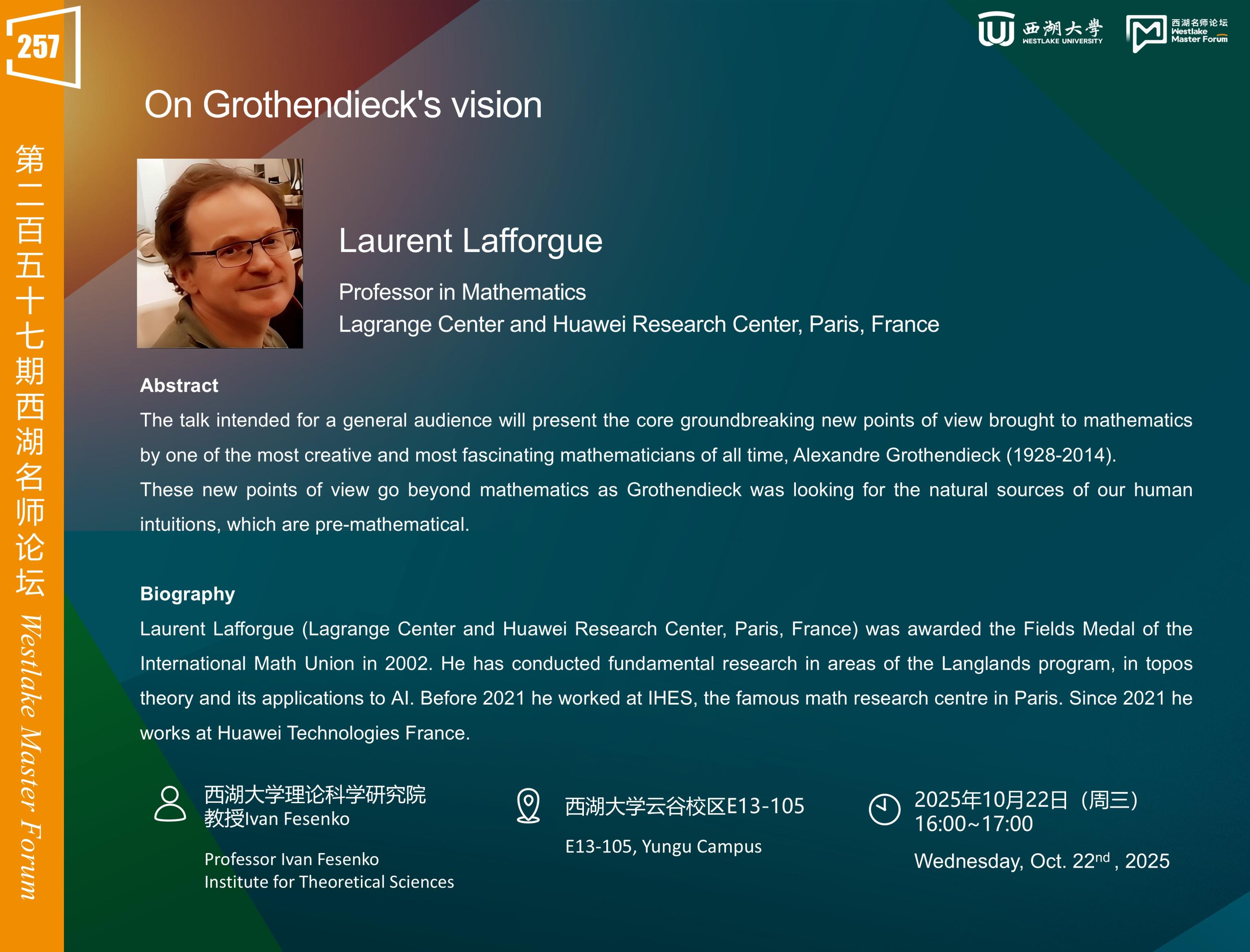 Biography:Laurent Lafforgue was awarded the Fields Medal of the International Math Union in 2002. He has conducted fundamental research in areas of the Langlands program, in topos theory and its applications to AI. Before 2021 he worked at IHES, the famous math research centre in Paris. Since 2021 he works at Huawei Technologies France.