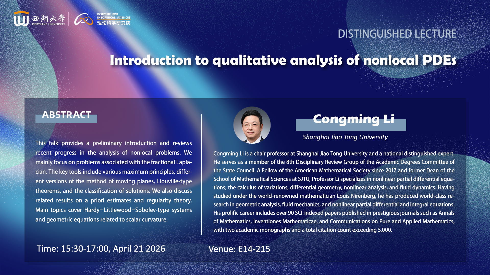 Biography: Congming Li is a chair professor at Shanghai Jiao Tong University and a national distinguished expert. He serves as a member of the 8th Disciplinary Review Group of the Academic Degrees Committee of the State Council. A Fellow of the American Mathematical Society since 2017 and former Dean of the School of Mathematical Sciences at SJTU, Professor Li specializes in nonlinear partial differential equations, the calculus of variations, differential geometry, nonlinear analysis, and fluid dynamics. Having studied under the world-renowned mathematician Louis Nirenberg, he has produced world-class research in geometric analysis, fluid mechanics, and nonlinear partial differential and integral equations. His prolific career includes over 90 SCI-indexed papers published in prestigious journals such as Annals of Mathematics, Inventiones Mathematicae, and Communications on Pure and Applied Mathematics, with two academic monographs and a total citation count exceeding 5,000.